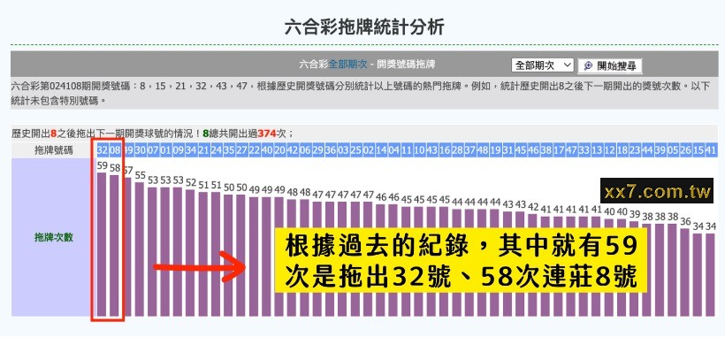 許多人會利用的六合彩拖牌策略,拖牌版路指的是選擇一個六合彩開獎號碼,然後根據歷史數據找出下一期最有可能開獎的號碼。舉例來說,如果這期開獎號碼是8號,根據過去的紀錄,8號總共開出374次,其中有59次是拖出32號、58次連莊8號。透過這些六合彩拖牌數據,玩家可以更有信心地進行下注。